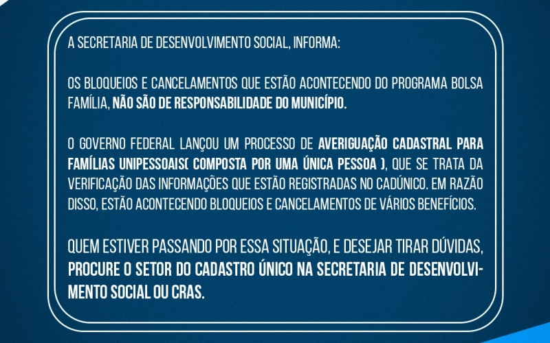 Atenção à informação da Secretaria de Ação e Desenvolvimento Social,sobre o Bolsa Família.